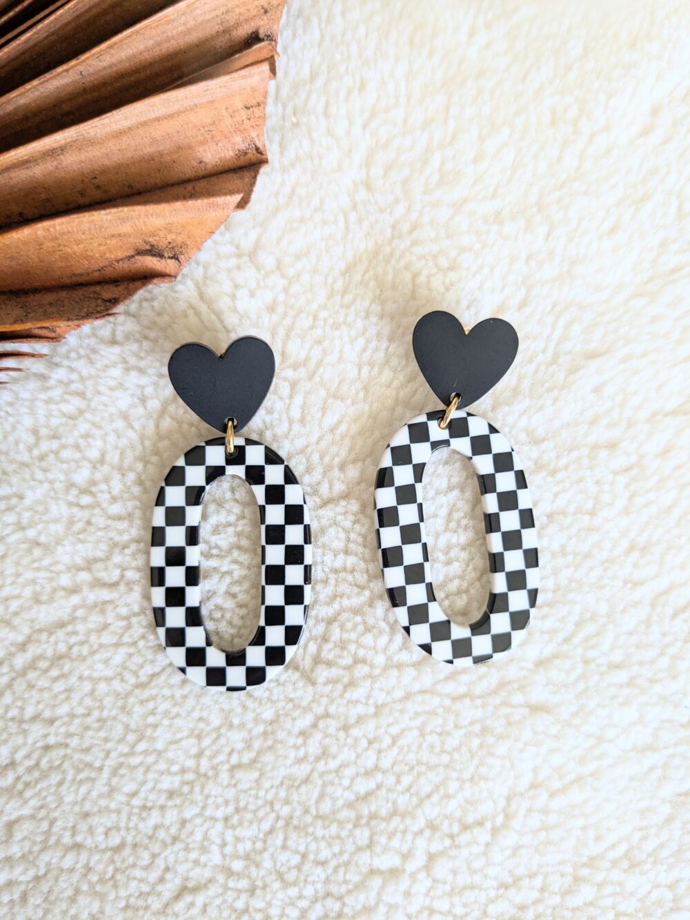 Deux petits cœurs noirs 🖤 accompagnés d’un motif damier à la forme ovale.